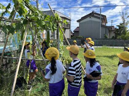 1学期末には見ることができなかったヘチマの実を目の当たりにした子供たちは、興味津々で観察をしていました。