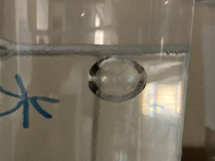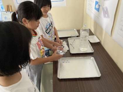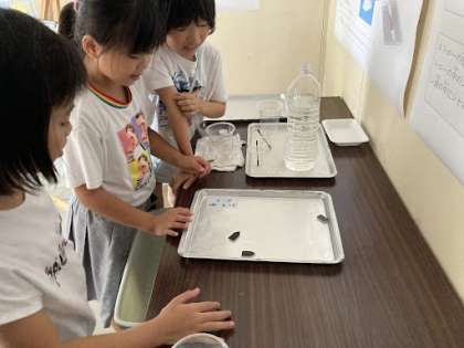 理科室前に設置してあるミニ実験コーナー「見に来て、ミニラボ」で水の不思議を体験しました。ボートの形に切った発泡トレイの底に秘密の液体を付け水に浮かべると、かってにすいすい進みます。もう一つは、シャボン液の中にできる水中シャボン玉。うまく作るには何度かチャレンジしてコツをつかむ必要があります。できたときは、「やった!」と大喜びです。