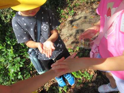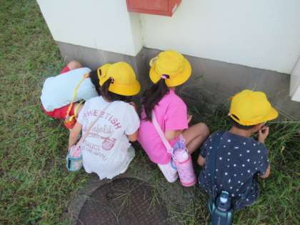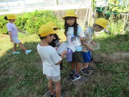 仲よくなりたい虫を決め、グラウンドやプール横に虫を探しに行きました。虫が苦手だと行っていた子供たちも、友達が捕まえた元気な虫を見て、おそるおそる触ってみたり観察したりしていました。