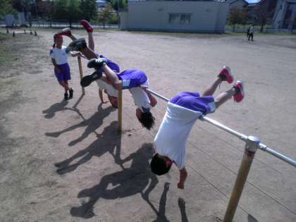 逆上がりができるように何度も練習する子供、難しい技に挑戦子供とそれぞれ課題をもって活動しました。