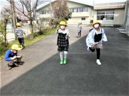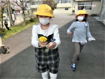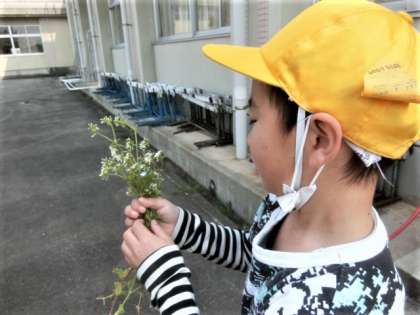 生活科の学習。春を見つける2年生。オリジナルブーケをつくって見せてくれました。