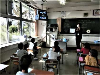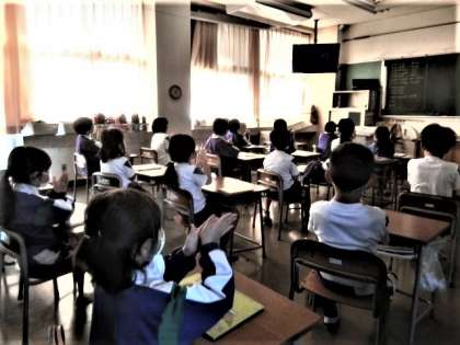 朝一番の学習。手洗いの画像を校内放送で全校に送り、実践してみました。