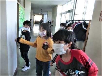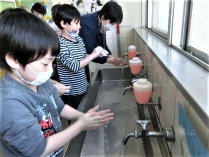 朝、全校で学んだ手洗いの仕方を思い起こしながら丁寧に手洗いする2年生。マスクもお似合いです。