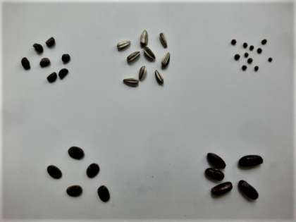 下の画像に、小学校の理科で扱う5種類の種子(しゅし)があります。それぞれ何の種子でしょうか?アサガオ、ヒマワリ、ホウセンカ、ヘチマ、インゲンマメの中から選んでください。