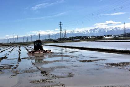 「代かき」をしているトラクターの向こうにうっすらと立山連峰が見えます。以前に、「田植えの前に代かきをする理由を調べてみましょう。」と呼びかけましたが、なっとくのいく答えは見つかりましたか。理由は一つではなく、1 田の水もれをなくす 2 でこぼこの土地を平らにして苗をうえやすくする 3 肥料をまぜる 4 雑草の発芽をふせぐ など、いろいろあるようです。米づくりには、まだまだ、様々な作業があるので、教科書などで、どんどん調べてみましょう。