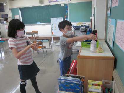 手に消毒液をつけ、互いに離れたところで手に液を広げています。