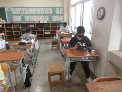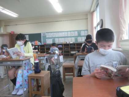 5年生は、風通しのよい教室で距離を保ちながら読書中。