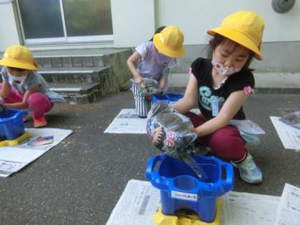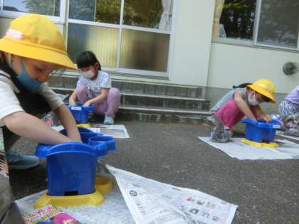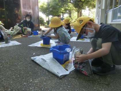 一人6つずつ、アサガオの種をまきました。これから、1年生がアサガオの保護者です。