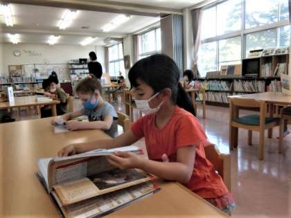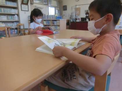 図書室で、本に親しむ1年生。図書室でのルールやマナーも学びました。