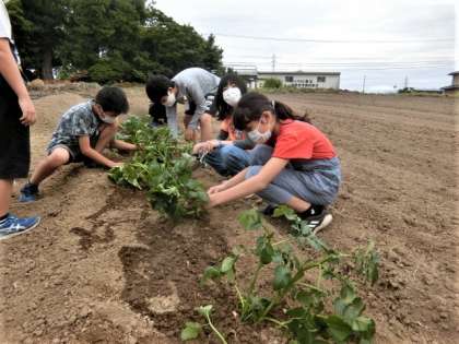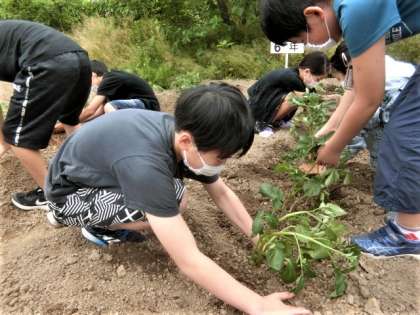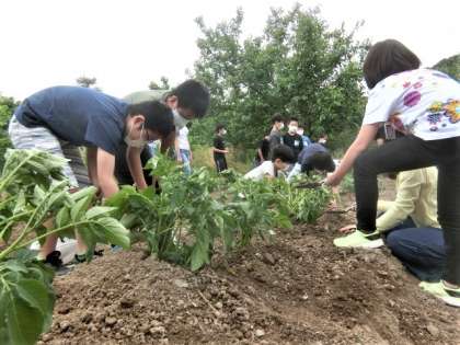 担任が、事前に育てていたジャガイモを農園に植え替えました。