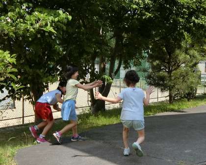 休憩時間の3年生。上から順に、上「あ、モンシロチョウだ。」中「待て待て。」下「やった、つかまえた。」です。