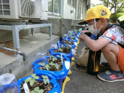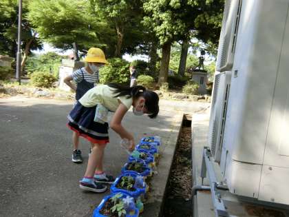 登校したばかりの1年生。自分のあさがおに水をあげた後、花壇の草花にも水をやっていました。