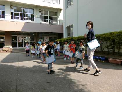 児童玄関前に生活科バックを初々しくぶら下げて整列した1年生。行先は、すぐそこです。