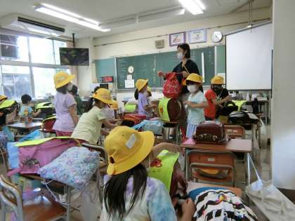 帰り支度をする1年生。分散登校から2週間。学校生活に慣れようと、どの子も、無我夢中でがんばってきました。ご支援、ご協力、ありがとうございました。