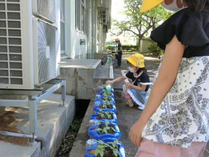 アサガオと朝の挨拶を交わす?1年生。ずいぶん長い間、たたずんでいます。