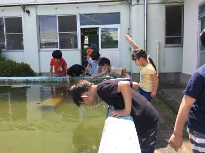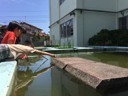 身を乗り出してザリガニを釣ろうとする1年生。その意気込みに感じ入ってか、愛嬌のよいザリガニが1匹、何もえさの付いていない釣り竿(木の枝)につながってくれました。万歳。