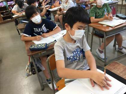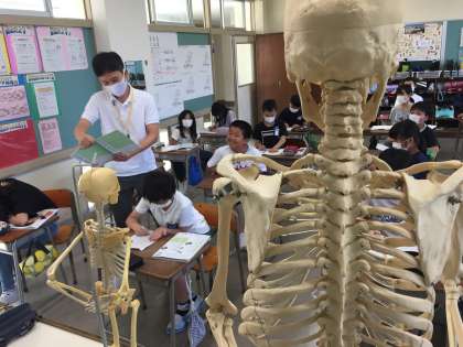 4年生の理科。今日は、自分の手を見たり触ったりしながら、手の骨の形や長さ、本数等を調べてみました。