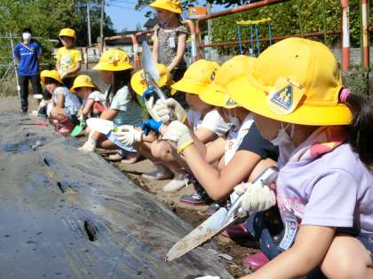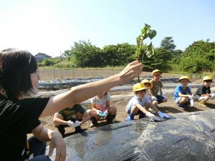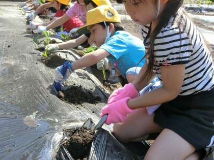 1年生の1時間目は、生活科の農園作業。サツマイモづくりの始まりです。