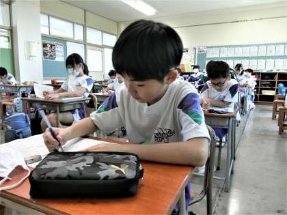 小数のわり算は、5年生の難題の一つ。わり切れるまで計算したり、商を概数にしたりと、5年生は、課題の指示に的確に対応できるよう計算練習を重ねています。