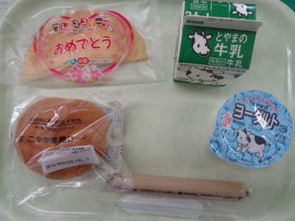 6月12日(金)の簡易給食のメニューは、黒糖ロールパン、牛乳、魚肉ソーセージ、ヨーグルト、クレープです。今日もおいしくいただきました。