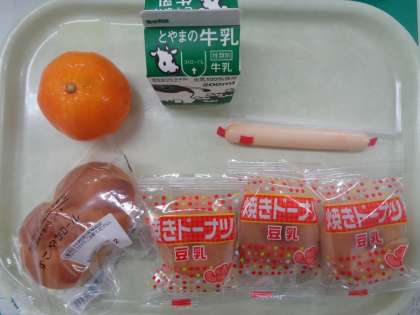 休み明けの簡易給食のメニューは、ロールパン、牛乳、豆乳ドーナツ、チーズかまぼこ、冷凍みかんです。