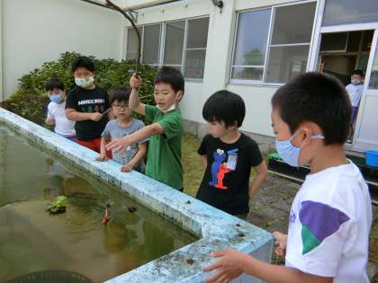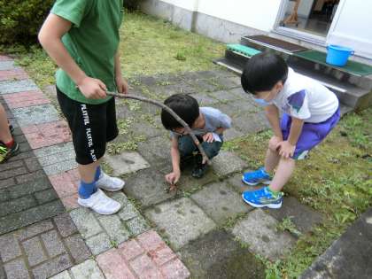 休憩時間にザリガニ釣りを楽しむ子供たち。バケツの中は、ザリガニでいっぱいです。