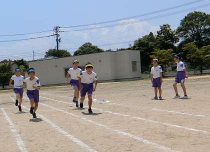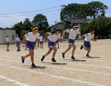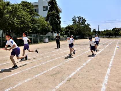 リレーの学習。バトンパスのロスタイムを無くすことを目標に、一人一人が全力を尽くしました。