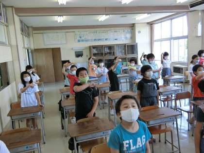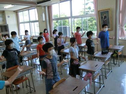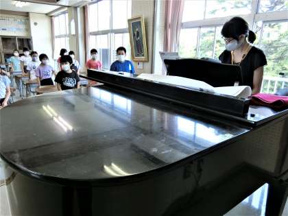 音楽室から、4年生のきれいな歌声が聞こえてきました。今日、歌っている曲の題名は、「にじ」です。