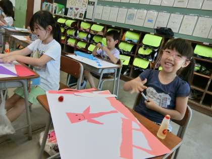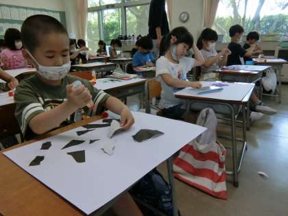 図画工作科の学習をする1年生。今日は、紙を指でちぎってパーツを作り、そのパーツから思い描いたことを広げていく学習をしています。