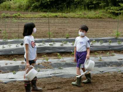 農園の土が湿っていても、毎朝、様子を見に来る子供たち。