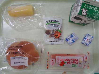 今日のメニューは、黒糖ロールパン、牛乳、ポケットチーズ、味付けビーンズ、いちごスティックケーキ、冷凍パインです。おいしくいただきました。