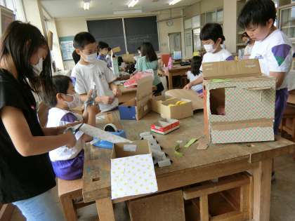 段ボールなどを材料に、4年生は、楽しげにアイディアボックスづくりを進めています。