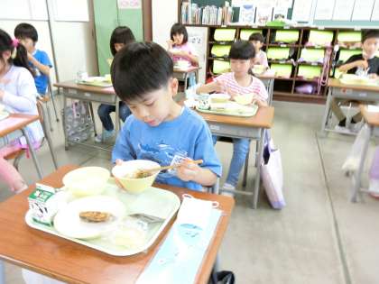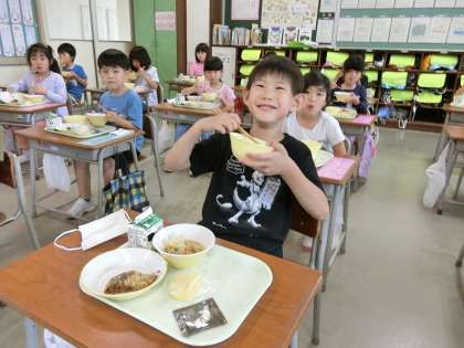 「豚汁がおいしい」と、1年生は大喜び。