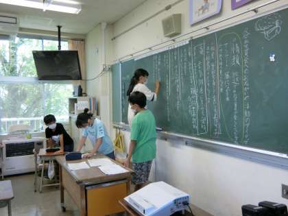 司会者グループが前に出て、児童会スローガンについての話合いを手際よく進めています。