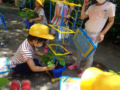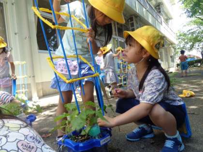 今日は、今のアサガオがもっと大きく育つためにはどうしたらよいかみんなで考えました。「おじいちゃんが肥料をあげたらいいって言っていたよ!」「棒を立てたら、もっとつるが上に伸びていくよ!」等、子供たちが知っていることや聞いたことを紹介し合い、その後、みんなで追肥したり、支柱を立てたりしました。早く花が咲いてほしい1年生です。