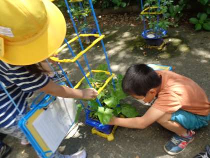今日の生活科の学習ではアサガオの観察をしました。「葉っぱが自分の手よりも大きくなったよ!」等、前回観察したときより、大きく育っているアサガオに子供たちたちは驚いていました。