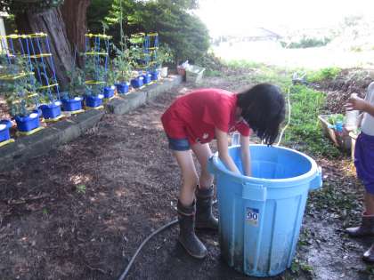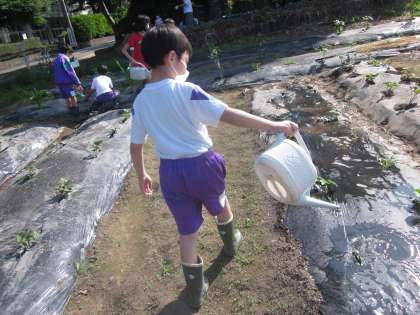 梅雨の合間の晴天が続いたので、子供たちは農園の水やりをしっかりと行いました。