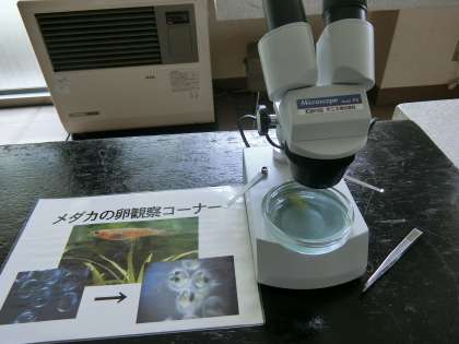 昨日、双眼実体顕微鏡で観察したメダカの卵を理科室で継続観察しました。