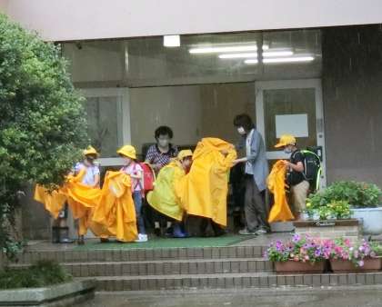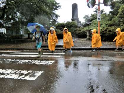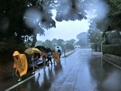 大雨の中、登校した子供たち。おかげさまで、今日も無事故でした。