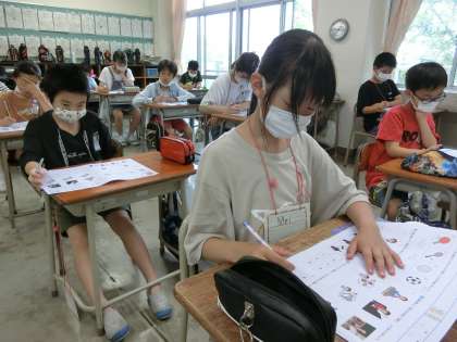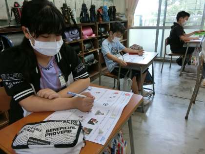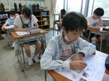 英語を聞いて、設問に答える5年生。一昔前の中学生の学習風景のようです。
