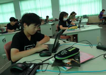 コンピュータ室の6年生。国語科の学習として提案する文書をつくるために、情報収集しているところです。
