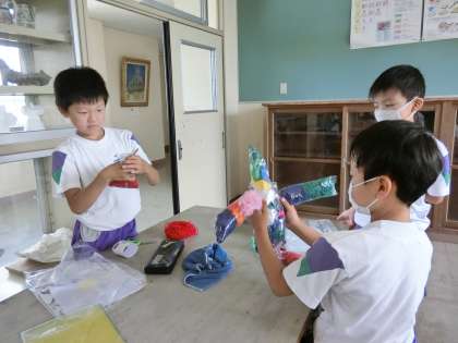 図工室の3年生。色や形にこだわりながら、カラフル・フレンドを制作中。