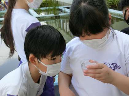 今日は、一人ずつメダカをつかまえて、マイ・メダカの雌雄を判別しました。