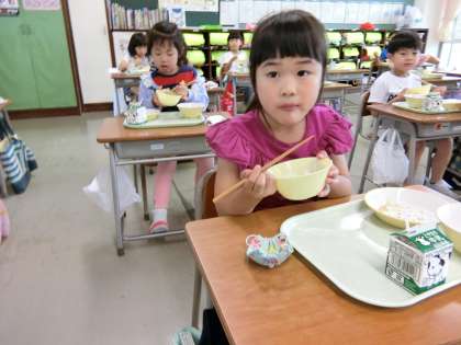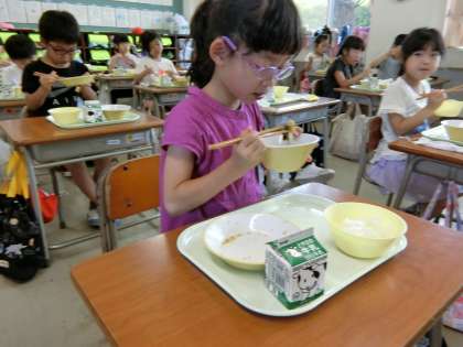 1年生のランチタイム。「たくさん勉強して、おなかがぺこぺこ」なのだそうです。