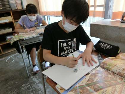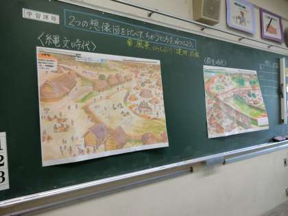 6年生。縄文時代と弥生時代の想像図を比べながら、違いを見つける学習をしています。