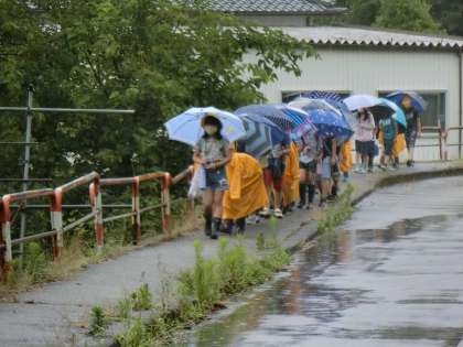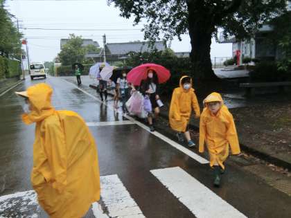 大粒の雨が降る中、子供たちは登校しました。
