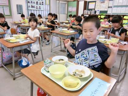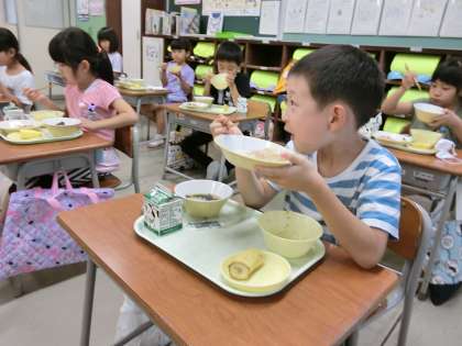 今日から、通常の給食開始。1年生は嬉しそうです。