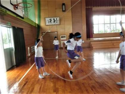 体育館で、ダブルダッチにチャレンジ。回し手も跳ぶ側も一生懸命です。