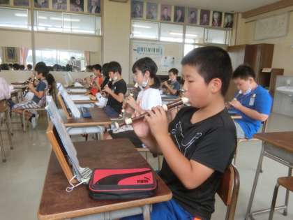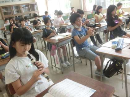 澄んだ音が出せるよう、息づかいや運指に気を配って練習を重ねる4年生。