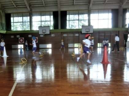 体育館の2年生。ミニハードルなどの障害物をリズミカルに乗り越えていきます。